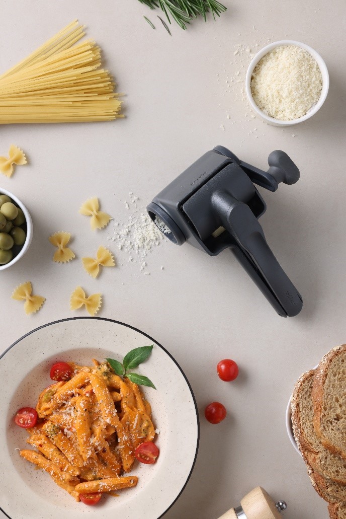 Die Reinigung ist besonders einfach: Der Griff lässt sich um 180° öffnen, und die abnehmbaren Teile sind spülmaschinengeeignet. Zusätzlich ist ein Set mit aufsteckbarem Auffangbehälter erhältlich, der sauberes Arbeiten, Servieren und Aufbewahren ermöglicht.