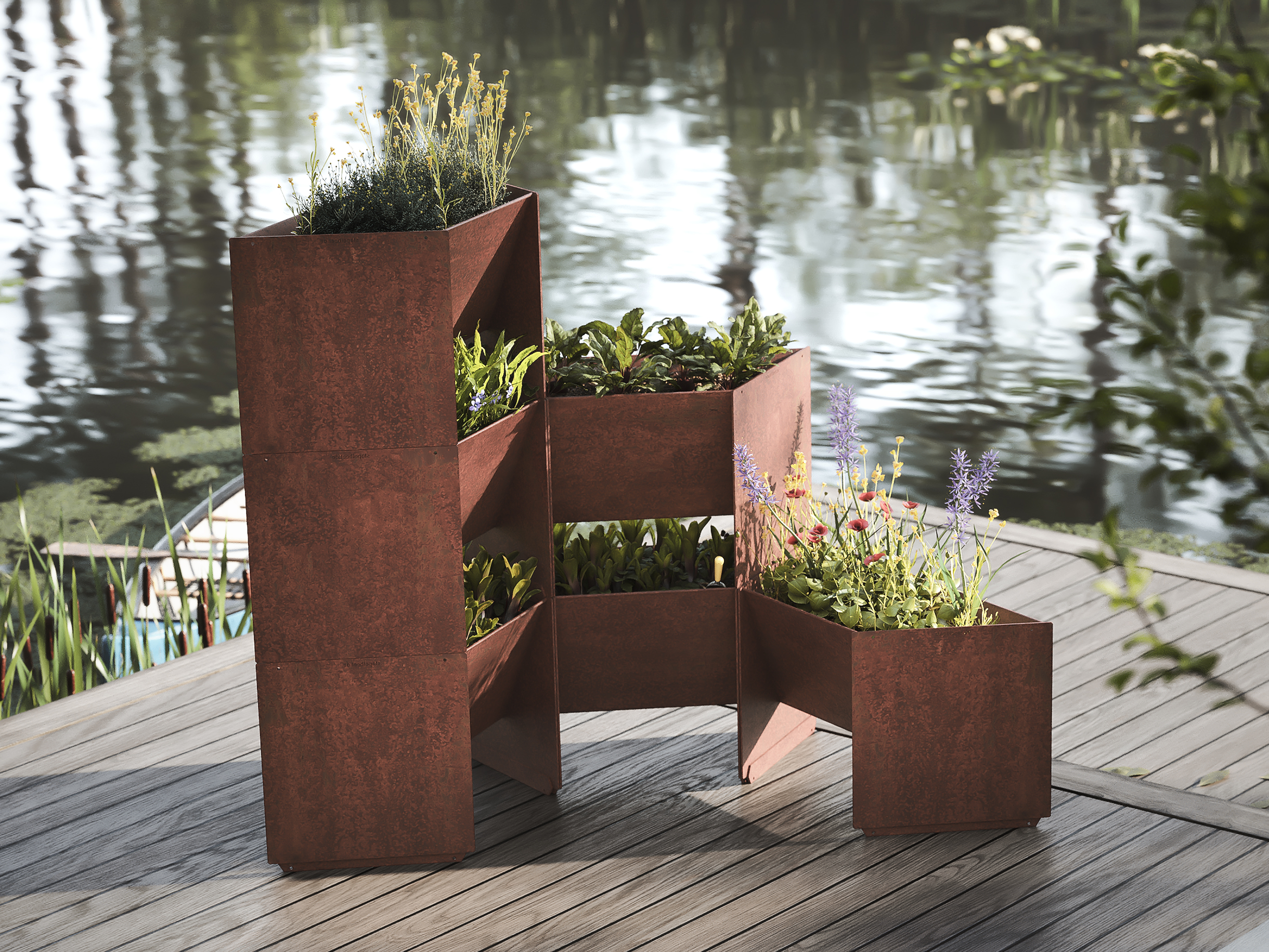 Das Hochbeetsystem überzeugt durch sein intelligentes Modulsystem und die Verwendung von hochwertigem Cortenstahl. Die Seitenwände werden einfach in stabile Säulen eingesteckt und lassen sich beliebig erweitern. Dank eines speziellen Vertikal-Verbinders sind die Module stapelbar und ermöglichen ergonomische Arbeitshöhen. Dabei ergeben drei übereinander gesetzte Elemente beispielsweise eine komfortable, rückenschonende Höhe von 90 cm. Integrierbare Bewässerungslösungen, bis zu 100 kg belastbare Einlegeböden mit Drainageöffnungen sowie die Kombinierbarkeit mit remesh eröffnen zusätzliche funktionale und gestalterische Möglichkeiten, wie die Integration von Rankhilfen oder Schattenspendern.